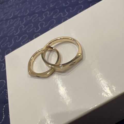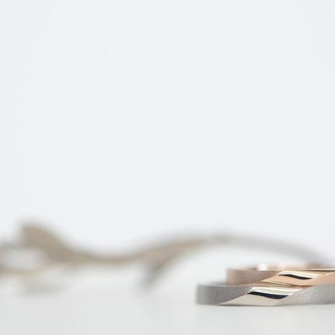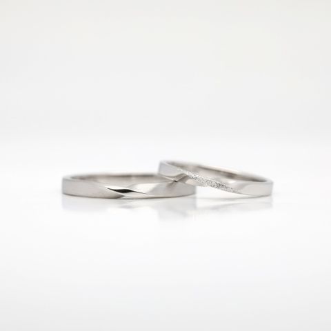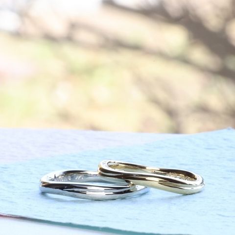 少し湾曲したデザインでピンクゴールド、プラチナ、ダイヤの3色で女性のものはできています。ダイヤの輝きがとても綺麗です。また、指輪が湾曲していることによって指が細く長く見えました。男性の方は2色になっていて、ヤスリ加工のようなものができました。なかなか被らなくて、オリジナルを求めている方にはとてもおすすめです。
