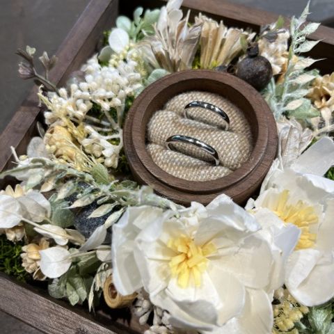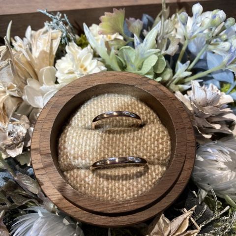 指輪とかは特につけたことがない私でしたが 沢山相談させていただき幅1.5mmpt900つちめにしました 写真で拝見した時はつちめはちょっと私には似合わないかなと思いましたが試着させていただきビビッときました。 つちめも自分たちの力加減次第でデザインがガラリと変わり私たちはあまり凹凸を出さす控えめにさせていただきました。 手を動かした時に凹凸がキラキラしてとても素敵な宝物ができました。