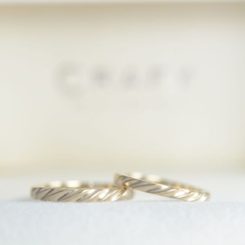 シンプルでずっとつけられる物を探していて、ブランドにも憧れはありましたが価格が高いのが正直ネックでした。こちらは手作りで1から作れるので満足いくデザインを決められるし、唯一無二のオリジナルで思い出にもなり、価格も安くなる。ということでこちらに決めました。 婚約指輪もまだだったので、セットで作って重ね付けできるようにデザインを統一できたのも良かったです。 デザインは「シンプル」というざっくりしたイメージだけで参考写真を先に送って、現地で素材や幅の違ういくつかのサンプルを見せていただきながらじっくり決めました。 特に夫婦でデザインを揃えることはなく、それぞれ自分たちに似合う色合いで決めました。夫はプラチナシルバー(ヘアライン加工)、私は18金イエローゴールド(鏡面加工)2人で時間をかけて手作りするのがとても楽しかったです。婚約指輪の方は、ワックス加工で基本の部分だけ作って後で石を加工していただくという工程でした。