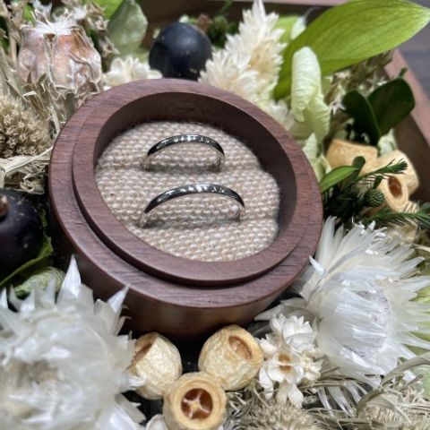 私は夫の指輪を。夫は私の指輪をそれぞれ作成しました。プラチナの素材で指輪の内側に二人の名前と結婚記念日、ダイヤをいれました。ビジネスシーンや普段使いでも派手になり過ぎない、シンプルなデザインにしました。
