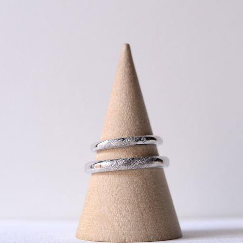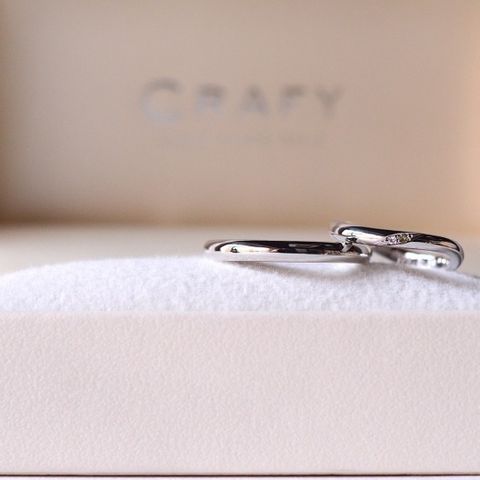 指輪のデザインとして、クラッシュの加工がポイントになっています。 男性側は全体の4分の3、女性側は全体の4分の1にクラッシュ加工が施されており、あわせて1個分となるように工夫しました。 シンプルかつ個性的でお気に入りです。