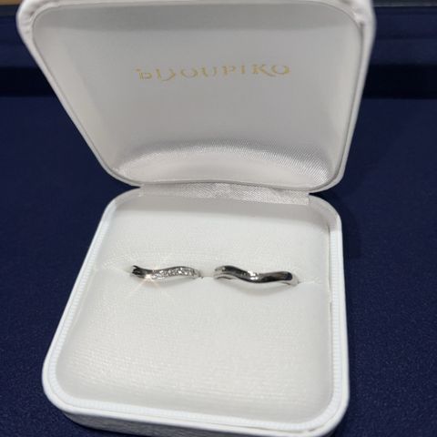 2つで10万円以下とお安く、シンプルなデザインで飽きが来ない、流行りに囚われないデザインで、どんなコーディネートにも合う。ダイヤがウェーブ状で埋め込まれていて、可愛くて綺麗です。男性用も女性用もウェーブなので、ペア感があります。