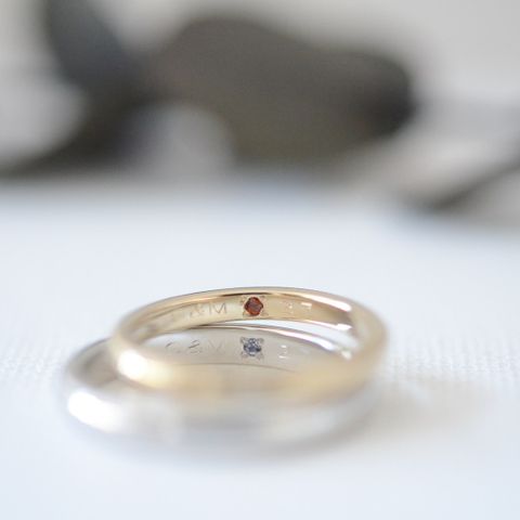 リングを毎日複数つけているので 何にでも合わせやすいシンプルで 飽きのこないデザインにしました。 ただシンプルすぎるのもせっかくの手作りで作るのに もったいないなと思い、今回はマットな仕上がりで 刻印を内側に入れたり石を埋め込んだりと 相談しながら作成しました。