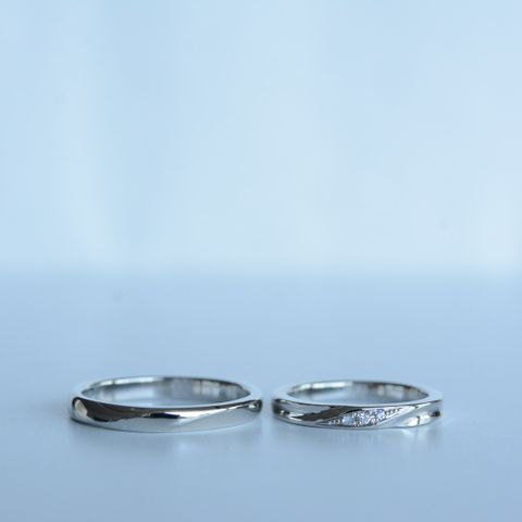 旦那は、男らしい手が特徴だったので太めのデザインの指輪を選ぶことにしました。あえて鏡面を少なくすることで自分の納得のいくデザインに仕上がりました!嫁は一般的にプラチナが多いところをピングゴールドを選び、さらに2石ダイヤを追加することで、素敵なデザインに仕上げられました。