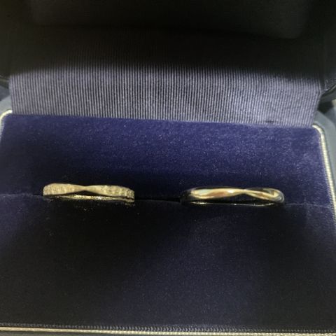 指馴染みが良く着け心地がとても良かった。 ブラウンゴールドが特別感があって2人だけの大切な指輪になると思った。 女性側のデザインがダイヤが良く見え、ウェーブの形とマッチしていた。 男性側のデザインもマット加工がされていて女性側のデザインとマッチしていた。
