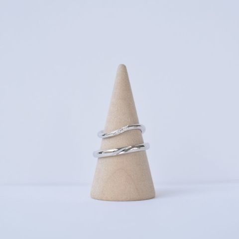 ペアリングで購入しました。 重ね付けがとても綺麗で、男性指輪も鋳造作成で頑丈な指輪にしてもらいました。 ダイヤを固定する台を大きくしない事で重ねる時に接触することなく1つの指輪に見えるように選定しました。