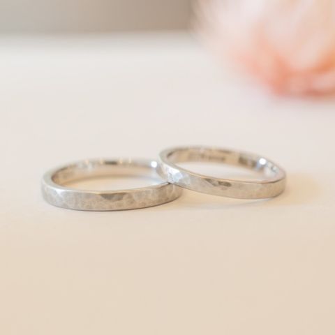 今回、素材は変色しにくさなどを考慮しプラチナを使用しました。デザインは、甲丸つちめ加工を施しています。内側に、イニシャルや日付を入れています。シンプルなデザインにこだわりたかったので、オプションの石は入れていません。