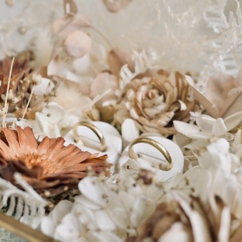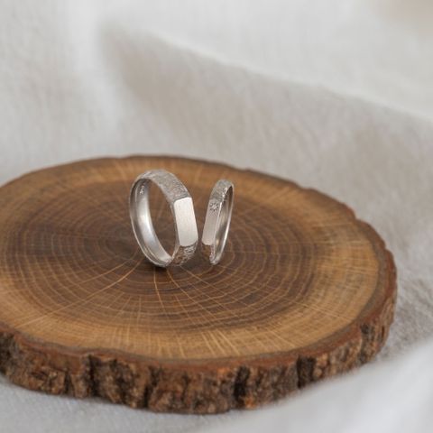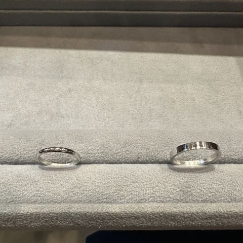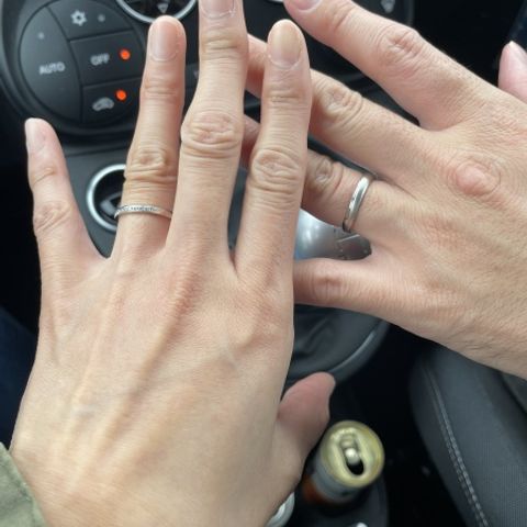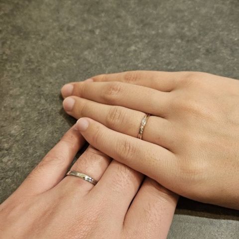 シンプルな感じが好きだったので、ひねったりせずシンプルなリングにしました。指輪の金属の種類もあわせずそれぞれが自分に似合う色で、日常に馴染むものを選びました。私の希望で選んだマットの質感も手元に馴染んで気に入っています。