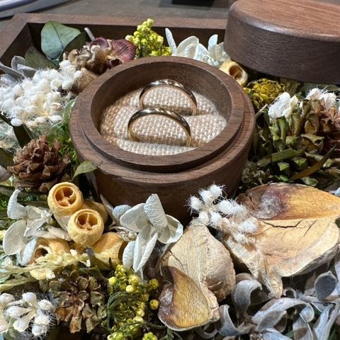 自分たちで削る作業をし、手作りしました。 内側に結婚記念日とイニシャルを刻印してもらいました。 マークも入れれたので好きなものを選び入れてもらいました。 シンプルで飽きがこないデザインなのがとても気に入っています。