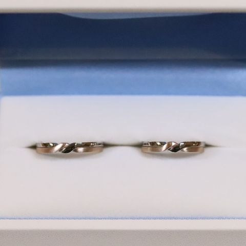 ギメルリングといって2素材が重なり合った知恵の輪のようなリング。双子リングとも言われるらしい。 一緒に製作するかつこのギメルリングだからこそ、「これからも一緒に。」という思いで作りました。 ピンクゴールドとプラチナで肌馴染みよくかつ結婚指輪感のあるものを制作しました。