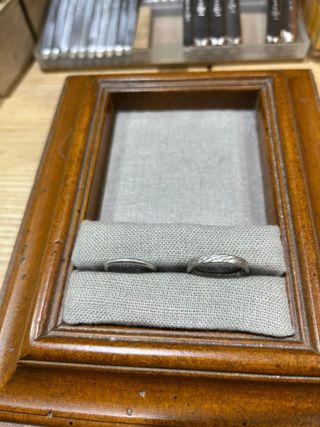 結婚指輪と婚約指輪を重ね付けできるか、組み合わせは拘っていましたが、過去の作成物の画像やサンプルを拝見してイメージがわきやすかったです。 そしてなんと言っても、指輪への拘りについては全て叶いました。指輪裏のメッセージも手書きで彫刻を入れていただけるため、指輪へのこだわりが強い人はぜひ相談されてみてください。