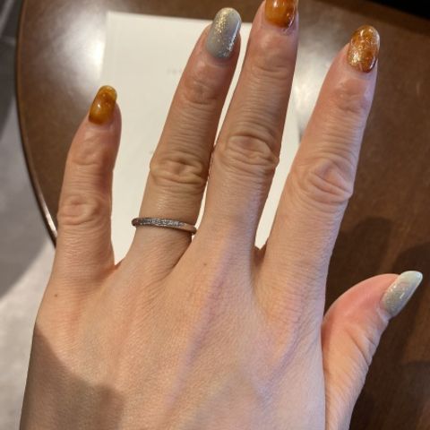 いろんなデザインを見たり、付けたりして満足いくものが見つかったのでこのデザインにしました。ダイヤモンドがとても輝きがあってとても綺麗でした。サイズやデザインが自由に選べるところも満足出来るところでした。