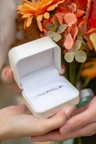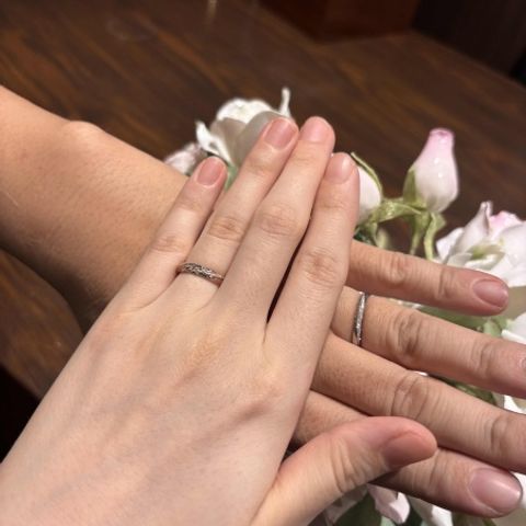 ダイヤが主張しすぎずキラキラ輝いているデザインが気に入りました!内側の文字も職人さんが1文字1文字手で掘ってくださっているようですごく小さな文字をバランス良くきれいに掘っていただいていて感動しました✨色々な組み合わせで自分たちだけの指輪が作れるところに惹かれました!
