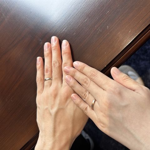 毎日飽きずにずっとつけていられるように、装飾のないシンプルなプラチナの指輪にしました。丸みのあるデザインであたりも柔らかい印象です。 太さも三種類の中から選べて、細いものと悩みましたが、2人で太さも揃えたことでお揃い感があって気に入っています。
