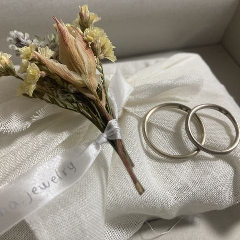 夫が太い指輪をほしがったので、他のお店ではなくて、自作になりました。 私の方は何の変哲もないシンプルな形ですが、デイリー使いしやすそうでいいかなと思います。 夫のはかなりの太さで(お値段もかなりしました…。)、本人も気に入っているのでよかったです。