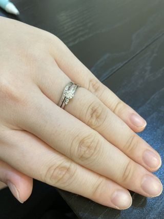 婚約指輪はあまり付ける機会がないと親には言われていましたが、私はお出かけやお食事でも付けられるように、結婚指輪と重ねて付けられるデザインがいいなと思いました。 また、婚約指輪らしく、ダイヤモンドが綺麗に見えることも大事にして選びました。