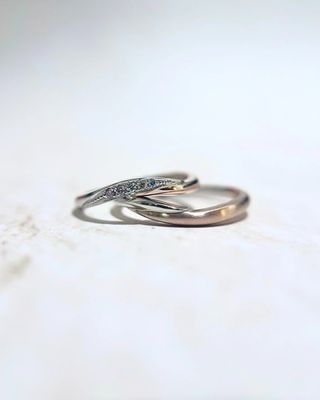 海の水面から連想されて作られたリングで、エンゲージリングとマリッジリング、同じデザインのセットリングとして販売されています。横から見た形もキレイです。今回は、流線型で結婚指輪と重ね付けした時に自然な感じになるところに引かれて購入しました!
