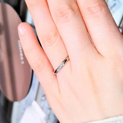 指輪の選定から購入まで彼が全て行いました。 私は様々なデザインの試着を行いました。 メレダイヤのデザインの指輪が欲しく、こちらを購入したそうです。ストレートのデザインですが、指先に向かって細くなっているため、指が綺麗に見えます。