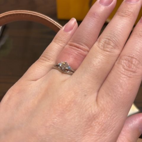 5店舗見て回って、色々試着したけど。どれもピンと来ず…妥協して決めようと思っていたけど、ネットで見た時に一目惚れしたこちらの指輪! 実物見て、もう本当に素敵なデザインに心奪われました。この指輪が良い!と初めてピンと来て、もうその日に購入しました!
