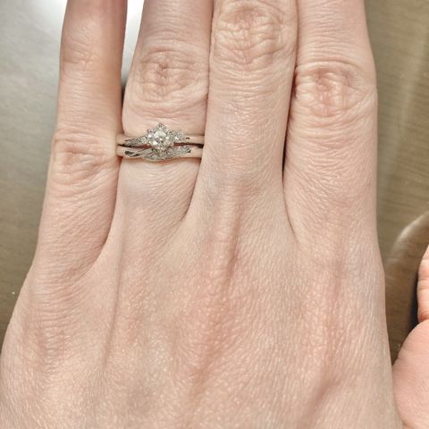 ウェーブのかかった細めのリングであるため、装着したときに非常に美しく見えます。また、ダイヤやリングが目立ちすぎることなく、他の指輪との相性も非常に良いため、結婚指輪と重ね付けしても綺麗だろうなと、今から楽しみです。