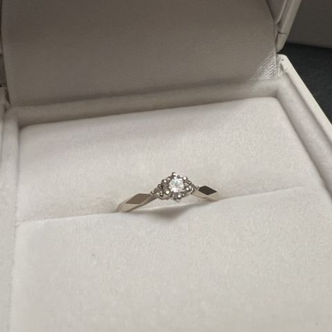 メインのダイヤの横にある小さなダイヤがあるものを選びました。リングはシンプルにねじれがなく、角が丸い輪っか形状を選定しました。ダイヤが3つならぶ箇所が、王冠みたいな形に見えるので、シンプルながらも少しだけ個性があり可愛らしいデザインです。