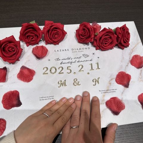 男性側はシンプルかつ日常的に付けやすいもの、女性側はダイヤモンドが輝くデザインを探しており、ぴったりなものが見つかった。 ずっと付けていたいデザインであり、それぞれの指輪のデザインに思いもあるのが良かった。オプションで刻印や、誕生日石等も入れることができ、一生大切にしたい指輪となった。