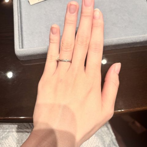 ウェーブがかっているデザインを希望で、 夫の指輪にはウェーブを境に、半分下をマット加工を入れてもらいセミオーダーにしました。 私の指輪は婚約指輪は購入してないので、ダイヤの主張がある程度あるものがいいと言う事で、最初は大きなダイヤが3つ連なってるものにしましたが、服にひっかかりほつれてしまったり、髪にひっかかって左側だけ傷んでしまっていたりしました。 購入して3ヶ月程で紛失してしまい、それを機にデザインを同じシリーズの別のものに変更して購入しました。 ウェーブに沿うようにダイヤが線状に埋め込まれてて、日常生活に差し支えないくらいにキラキラしてくれているのでとても気に入っています。