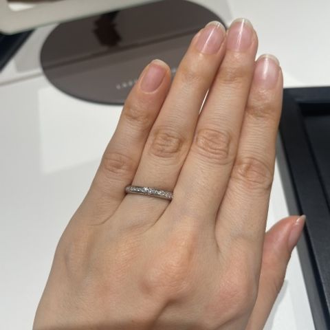 婚約指輪と重ねづけすると一つの指輪のデザインぽくなるのがかわいくて、決め手となりました。 普段使いしたかったので、ダイヤが埋め込みタイプで引っかかりもなく万が一でも外れる心配がないものを選びました。ダイヤがとてもキレイで結婚指輪だけでも見栄えがします。