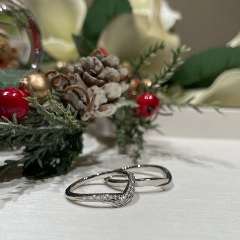 他にないデザインで特別感がある。ダイヤモンドも20石以上使用されており、豪華であった。少しV字っぽいので重ね付けもできて、他のリングとも相性が良い。男性のリングも普通のデザインではないので、他とは違ってとても良かった。