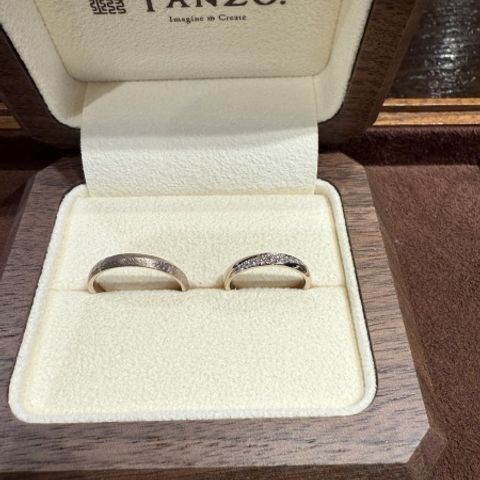 男性の指輪がマットな素材がよく探していましたが,エクセルコダイヤモンドさんではほぼ全ての指輪でマット加工ができ、またその加工する箇所まで選べるところが決め手でした。女性用の指輪については普段着けることがないのでつける時の特別感が欲しく、キラキラ感やデザインのあるものにしました。