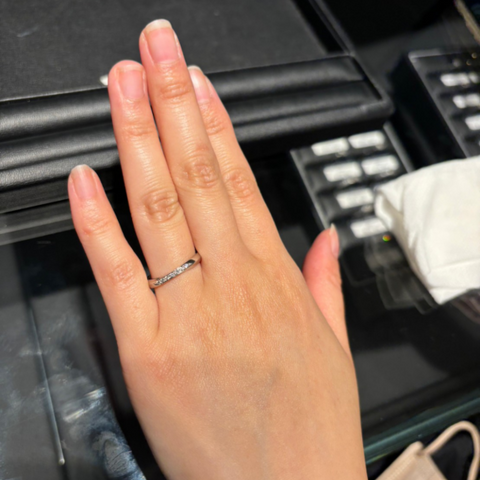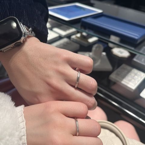 シンプルで飽きのこないリングを選びました。指の関節が太いのがコンプレックスでしたが、様々なタイプを試着させていただき細めのリングが意外と似合うことに気づきました。パートナーのリングも細めが似合うので合わせてこちらに決めました。