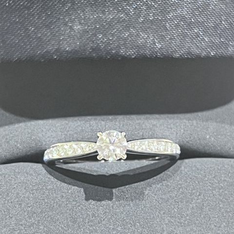 シンプルで、ザ婚約指輪のような形です。華奢なデザインが似合うので細め物で選びました。選んだ結婚指輪がハーフエタニティにしたので重ね着けでより存在感が増します。ダイヤモンド自体の大きさは0.3カラットほどですが、カラーがEなのでとても綺麗です。