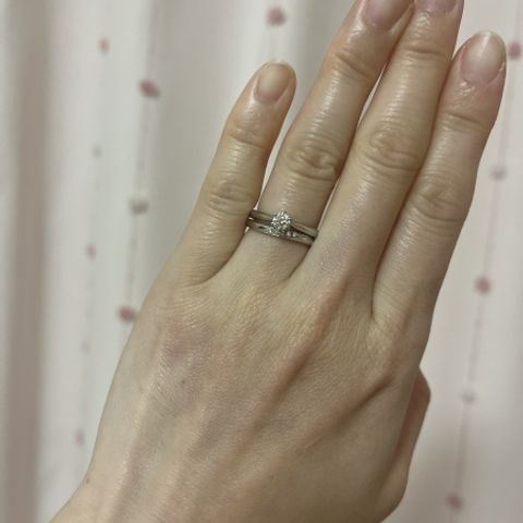 普段からつけたいなと思っていたのですが シンプルすぎても派手すぎても…と思っていましたが こちらの指輪はデザインが少し凝っていて ダイヤモンドが日に当たるとさり気なくキラッと光り 「綺麗だな〜」と見惚れてしまいます。 婚約指輪もこの凹みにスポッとハマり つけ心地も相性バッチリです! 価格帯も予想よりも抑えめだったのて 正直この指輪一択のような感じでした。