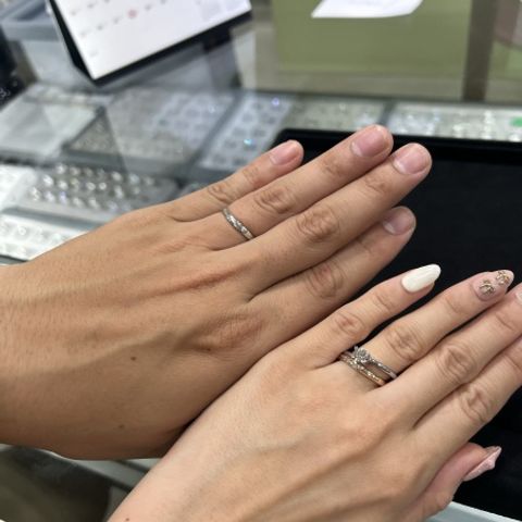 デザインに個性があり、二人が希望するデザインがたくさんの種類から選べるのが良かった。男性はマッドなデザインでシンプルだが個性が出せる、女性はダイヤのきらめきがしっかりありながらもシンプルに収まっている。