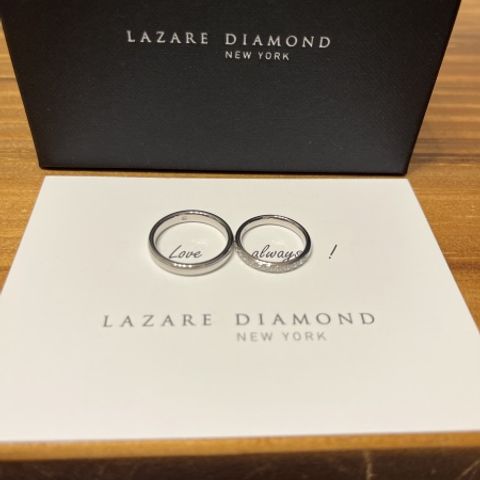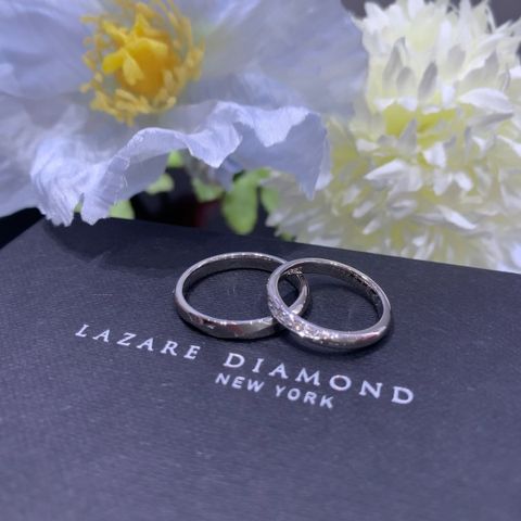 奥さんの方は、エタニティのゴージャス感とラザールのダイヤモンドの煌めきも合わさり、非常に気に入ったデザインでした。 自分の方は仕事でも使うのでペアにせず、シンプルかつオシャレなデザインにしました。 2個とも別々のデザインですが、大変満足してます