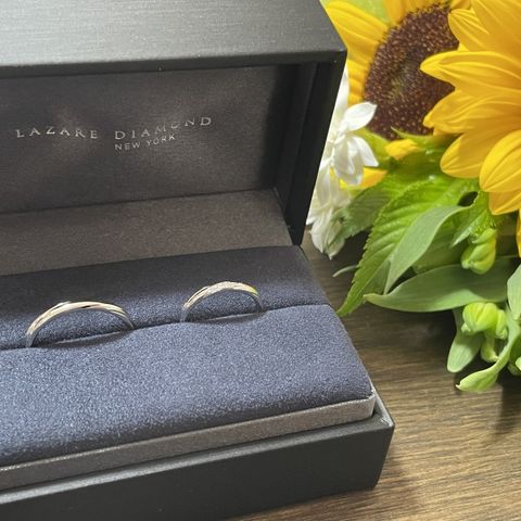 ・指輪のデザインとしては、流れるようなラインとメレダイヤが、メインのダイヤをより引き立たせてくれます。 ・私達の場合は結婚指輪を先に自作で作成しており、2本付けした際にデザインが合うものを探していました。結婚指輪に入っているねじれのラインと、クーパーズのねじれのラインの角度がほぼ一緒であり、一体感があったのでこちらの指輪にしました。 ・ダイヤの品質が好みでした。様々なブランドを見て回りましたが、ダイヤの輝き方(白色が多い、七色が多い、青く光るなど)がブランドで異なることに驚きました。ラザールさんのダイヤモンドは白色も七色もバランスよく輝き、私達の好みでした。