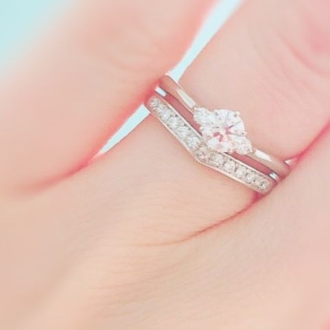絶妙なVラインで細目のデザインなので、婚約指輪単体でつけると華奢で指がきれいにみえます。結婚指輪と重ね付けすることでボリュームが出て、わたしのような大きい手でもバランスがとれるので、気分で変えられるのが気に入っています。
