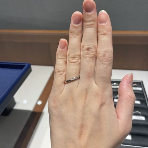 試着させて頂いた指輪の中でも細身で、着け心地が良いところを重視して選びました。デザインもシンプルなところがとても気に入っています。また、細かいダイヤがさりげなく入っていて、ふとした瞬間に輝くので、とても素敵です。