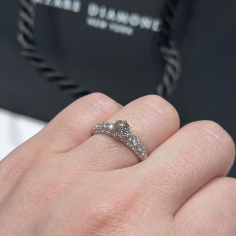 パヴェなので華やかに見えます。また、周りのダイヤと反射し合うので、センターダイヤがより輝いて見えるデザインです。ダイヤのサイズやランクも様々にあるので、合わせながら決められる点が素晴らしいです。結婚婚約だけでなく、他にも使えるデザインが多く、選ぶのがとても楽しかったです。