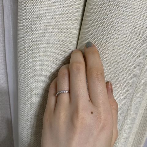 普段使いできるシンプルなデザインでありながら、ダイヤモンドがキラキラと輝いてとても綺麗な指輪です。 ダイヤモンドが斜めに入っているデザインなので、指が綺麗にみえるそうです。 着け心地むも良く、指になじみます。