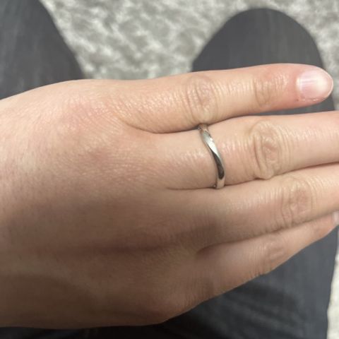 シンプルで着け心地も良く、とても気に入っています。 素材はプラチナを使用しています。光が当たると反射光が輝き眩しいです。指とのバランスを考えて少し幅ひろ目のデザインを選びました。色々試着した上で決めました。