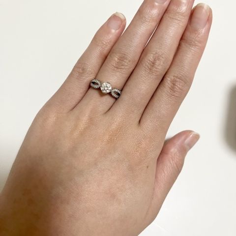 ネットで見た時からとても可愛いと思いこちら目当てで来店しました。 センターダイヤモンドが美しいのはいうまでもありませんが、横のダイヤも取り巻きのダイヤも美しく、一緒に虹色に輝きます。また、横の部分はレールどめなのでひっかかりも少なく安心かと思います。 店員さんに「横から見た姿もとても可愛いですよ」と言われ、その時はあまり気にしませんでしたが、購入して手元に来ると確かに横顔の綺麗さにうっとりしてしまいます。