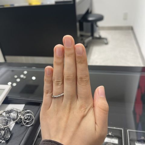 ストレートの指輪ととても迷いましたが、ウェーブのデザインにしました!ウェーブのフォルムが左手の薬指に沿う形に作られているので、とても指が綺麗に見えます。ダイヤモンドも、数が多いのでキラキラ感もとても楽しめます!