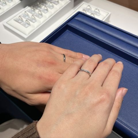 指輪のデザインがとにかく豊富で悩みますが、それだけ種類が多いのできっと自分に合ったデザインが見つかると思います。私は手が小さく細いので華奢な指輪を探していました。 漠然と探している指輪のイメージをスタッフさんに伝えるといくつか持ってきていただき、指輪の太さが細く、指輪の大きさに合ったダイヤ付きのタイプに決めました。 着け心地も良かったです。