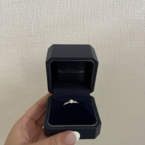 サプライズプロポーズのために、旦那さんが事前に用意してくれていましたが、シンプルかつ洗練されたデザインでダイヤモンドがとくに美しいもの、リングは細めのものが私の指に似合うと思って選んでくれたそうです。