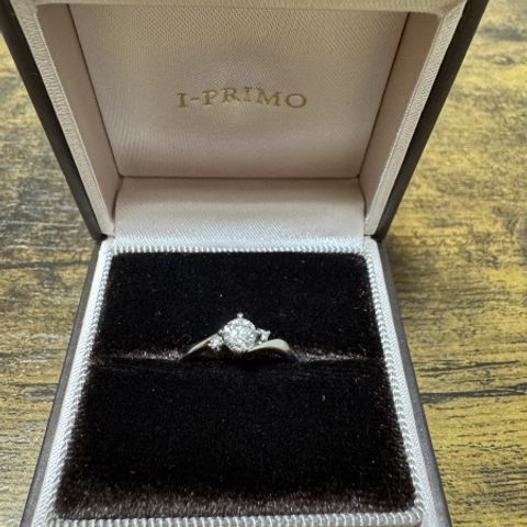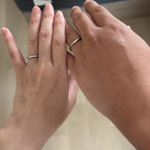 私たちのこだわりポイントとして、女性側のデザインはハーフエタニティであることと、ダイアモンドの輝きがしっかりあることでした。 ブリリアンスの指輪は同じデザインでも細いものから分厚いものまで豊富に幅が選べて、それに合わせてダイアモンド一つずつの大きさも変わるので、良い意味でとても迷いました! ミリ数は若干の差でも、指に付けてみると全然違うデザインの指輪に見えるぐらい変化があり、自分の指に1番しっくりくるものが選べた時はとても嬉しかったです。 男性側の指輪はシンプルながら存在感があるものが良かったので、真ん中に大きめのダイアモンドを入れてもらいました。 こちらはサンプルがなかったので実際手にすることは出来ず、少しイメージしにくかったですが、届いてみてとても良いものが仕上がったと大満足です。