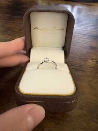 メレダイヤなし、プラチナ、ストレート、センターダイヤモンドひとつの王道の婚約指輪です。色々と試着させていただきましたが、結局一番心がときめいたのがこの指輪でした。メレありの指輪とも最後まで迷いましたが、地金だけのシンプルなデザインだからこそ、センターダイヤモンドがより引き立って見える気がしました。 また、一番手に馴染んで指が綺麗に見えるデザインだと思い、こちらのデザインに決めました。 婚約者はサプライズで指輪を用意するより一緒に選びたいと言ってくれており一緒に店舗に足を運びましたが、もし仮にサプライズプロポーズするとしても、このような王道のデザインを選んだと思う。と言ってくれてなんだか嬉しかったです。