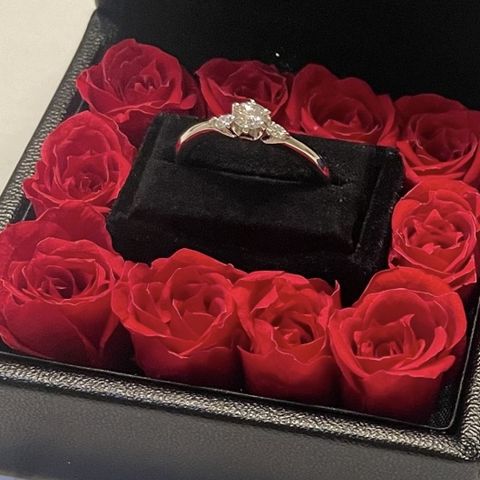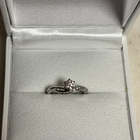ダイヤの大きさと輝きにこだわりって選定し、また紹介いただいたダイヤが結果ほぼ無色のものでかなり良いものになりました。また指輪のデザインもアシンメトリーで、結婚指輪との重ね付けも意識したもので彼女こだわりの一品となりました!