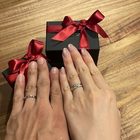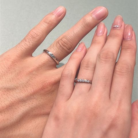指輪のデザインはたくさんあって自分にあった指輪を見つけられると思います。私たちは色々つけてウェーブがあっていたので、それに合わせてダイヤモンドがついている指輪にしました。毎日つけられるシンプルさの中にダイヤモンドが輝いているバランスが素敵だなと思いました。