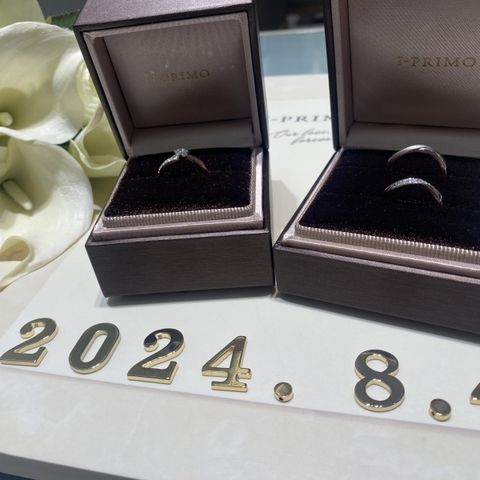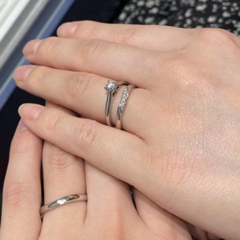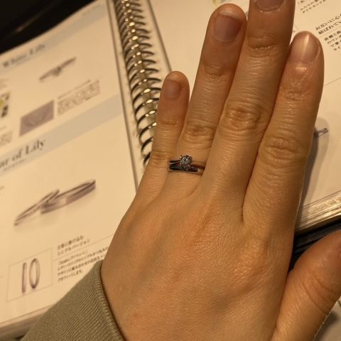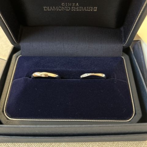 初めはダイヤがたくさん並んだ斜め模様の指輪を希望していましたが、店員さんに紹介いただいたリングに惹かれました。ストレートでありながら光が斜めに入り、表面加工が非常に綺麗で、着け心地が他ブランドとは比較できないほど滑らかでした。